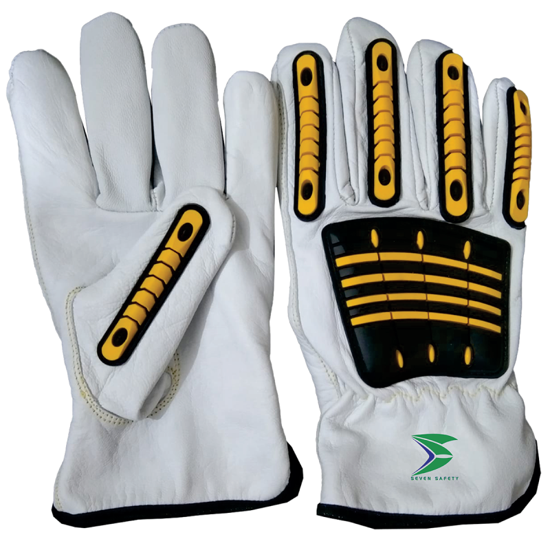 Crafted from top-tier, exceptionally pliable white leather, the SS-8012 delivers an enduring foundation of resilience and a customized fit that progressively adapts to the wearer’s hand. The defining characteristic of this glove is its innovative ribbed yellow Thermoplastic Rubber (TPR) guarding system. These distinctive, raised segments are strategically integrated across the back of the hand and along each finger, creating a robust, multi-ridged shield. This advanced design offers formidable defense against crushing impacts, severe abrasions, and unpredictable blunt forces – pervasive hazards in heavy-duty work. The prominent black frame around the TPR, coupled with the instantly recognizable green and black “Seven Safety” emblem on the knuckles, underscores our unwavering dedication to crafting elite-grade personal protective equipment (PPE).