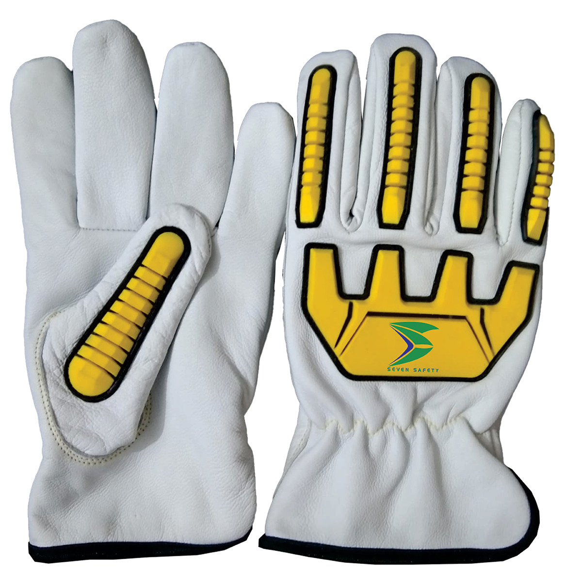 Forged from robust yet remarkably supple white leather, the SS-8009 offers an enduring foundation of durability, promising exceptional abrasion resistance and a fit that molds perfectly to the contours of your hand over time. The striking hallmark of this glove is its integrated vivid yellow Thermoplastic Rubber (TPR) guarding system. These boldly coloured, engineered segments are strategically positioned across the dorsal side of the hand and extending along each individual finger, forming an impenetrable barrier against percussive impacts, pinching forces, and surface abrasions – ubiquitous hazards in heavy industry. The crisp black outline of the TPR elements, combined with the instantly recognizable green and black “Seven Safety” emblem on the knuckles, powerfully conveys our unwavering dedication to crafting top-tier personal protective equipment (PPE).