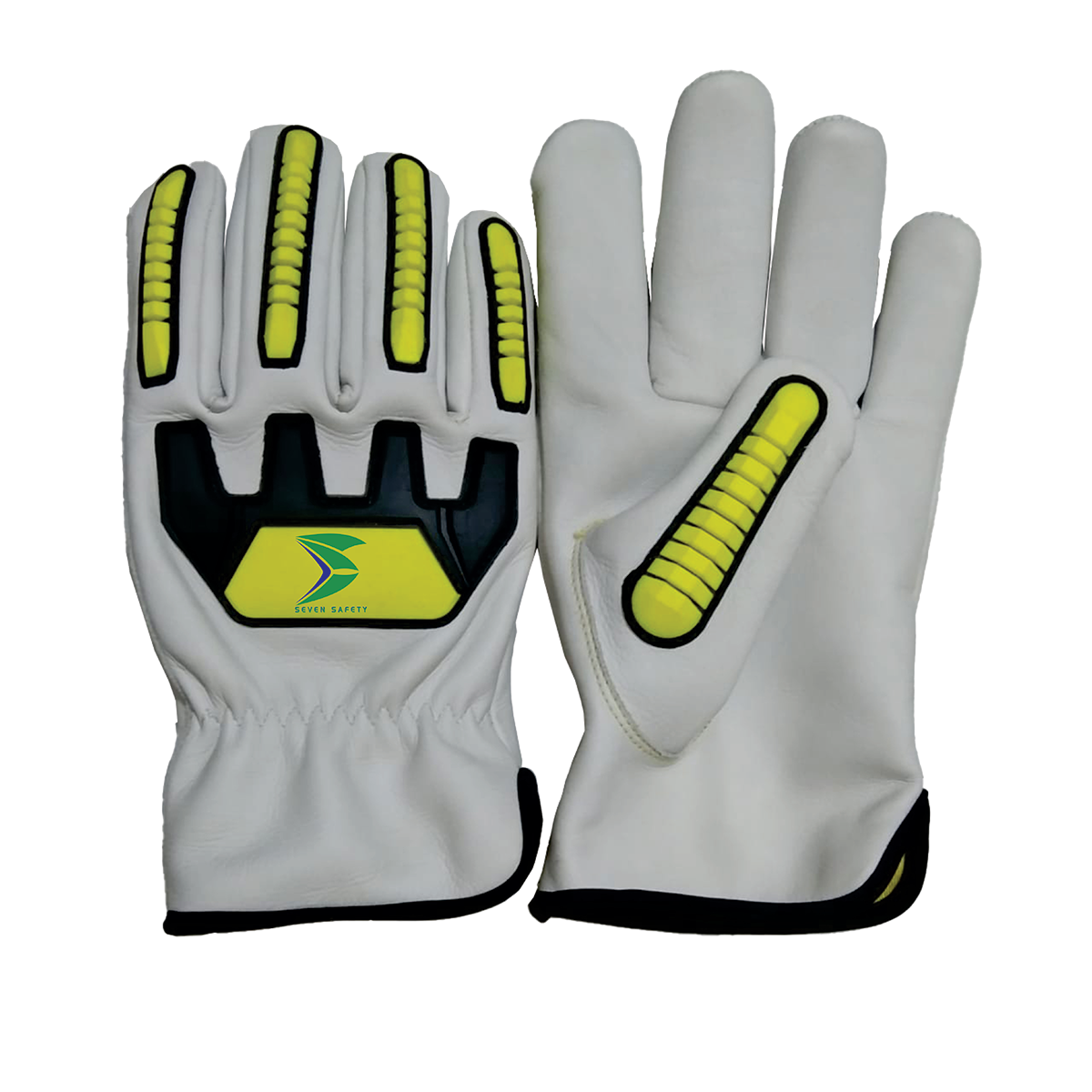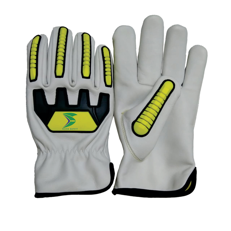 Crafted from high-grade, supple white leather, the SS-8003 gloves deliver exceptional comfort and resilience. What truly sets them apart is the strategic integration of vibrant neon yellow Thermoplastic Rubber (TPR) on the back of the hand and individual fingers. This distinct, eye-catching yellow not only offers robust safeguarding against impacts, crushing hazards, and abrasions but also significantly boosts your presence in busy or low-light work zones. The bold black frame around the TPR, coupled with the signature green and black “Seven Safety” logo on the knuckles, underscores the glove’s rugged design and reliable brand quality.
